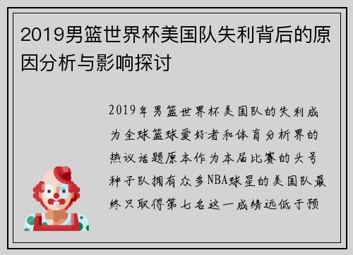 2019男篮世界杯美国队失利背后的原因分析与影响探讨